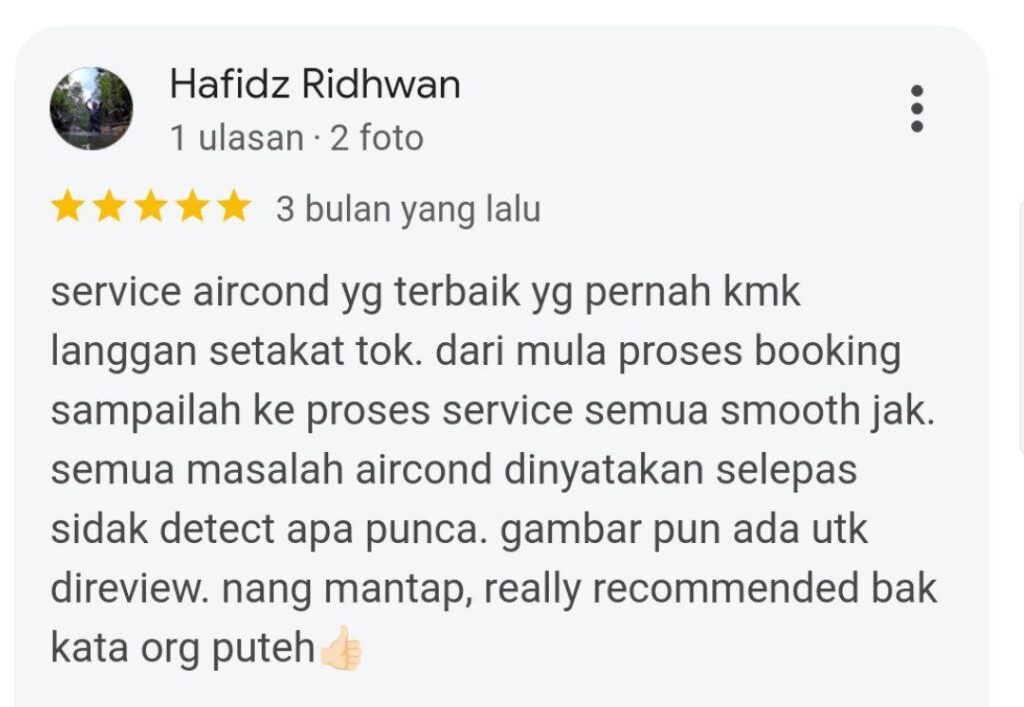 Tempoh servis biasanya ambik masa dalam 30 hingga 60 minit untuk satu unit aircond, bergantung dengan jenis servis (General Cleaning atau General Cleaning Plus) tengok keadaan unit ya juak camni.